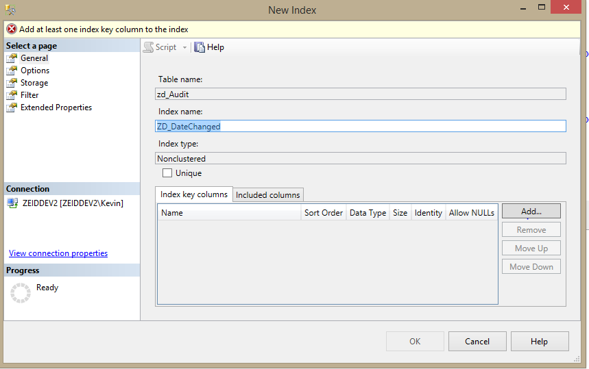 Expand the ZD_Audit table properties and right-click on indexes and select new index >> non-clustered index.