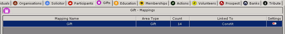 Area Settings work with an entire mapping. Below, you can see a gift mapping. Since the settings button to the far right is red, we know that there aren't currently any area settings added to change how this gift mapping is entered into the Raiser's Edge.