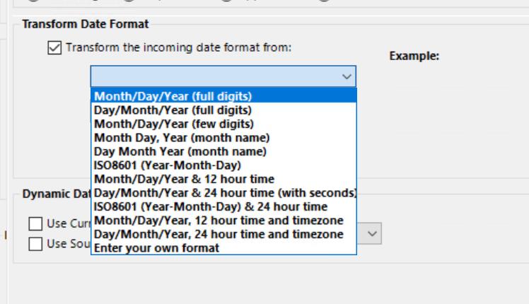 In Importacular, you can perform several different data transformations on date fields. You can use a formula to transform a date format into the standard for your instance of Raiser's Edge, you can opt to use the Current date or you can opt to set either the Current Date or the Source Date a specific duration into the future or the past.