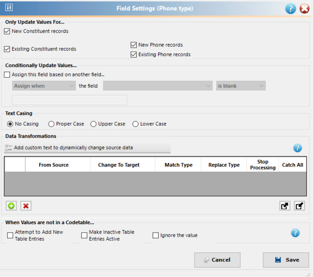 Fields that are Table based (such as a Phone Type, Solicit Code or Suffix). As seen in the screenshot below, you can work with a selection of what records to update, add conditions as to which records to update, correct the casing, add Data Transformations and determine what to do when the entries in your data source do not match the active fields in that code table**.