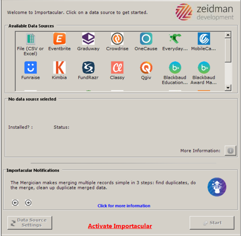 3) Make sure that you first click on your Data Source before clicking on Start. Data Sources include File as well as partners such as Classy, Qgiv, Mobilecause, etc.