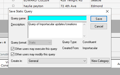When you click import from the Review Screen, you will be prompted to give your static query a name.