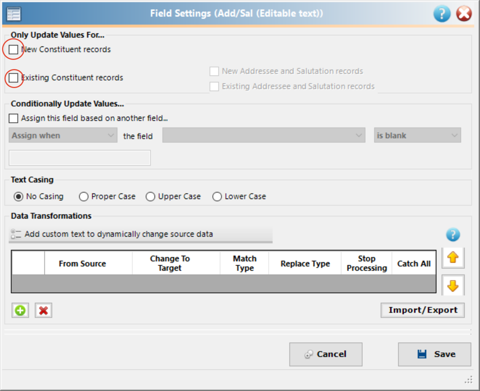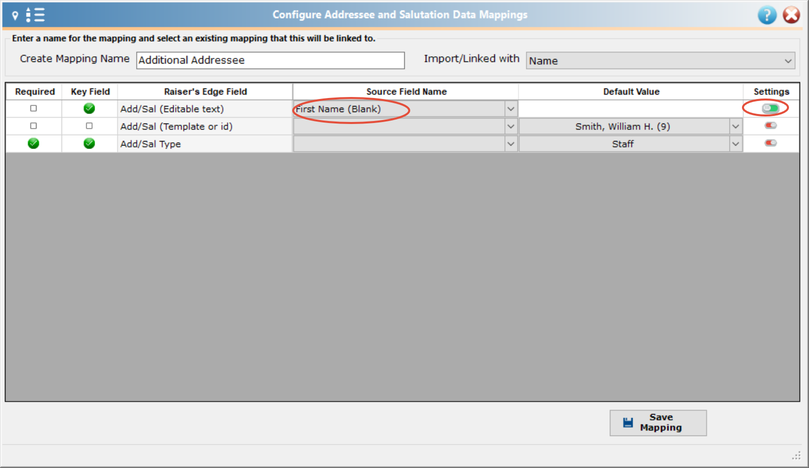 In version 5.7, we extended the scope of our new Key Fields functionality to cover more mapping areas within Importacular. Unfortunately, within the Additional Addressee/Salutation mapping we did not place a conditional value on the Add/Sal (Editable Text) field. This means that Importacular in now expecting you to populate that field, even if you have populated the 'Add/Sal (Template or Id)' field.