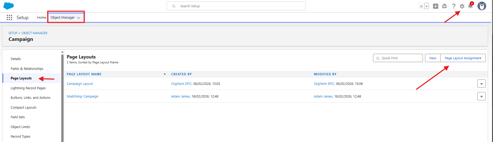 - Click the Page Layout Assignment button that appears on the right hand side of the screen