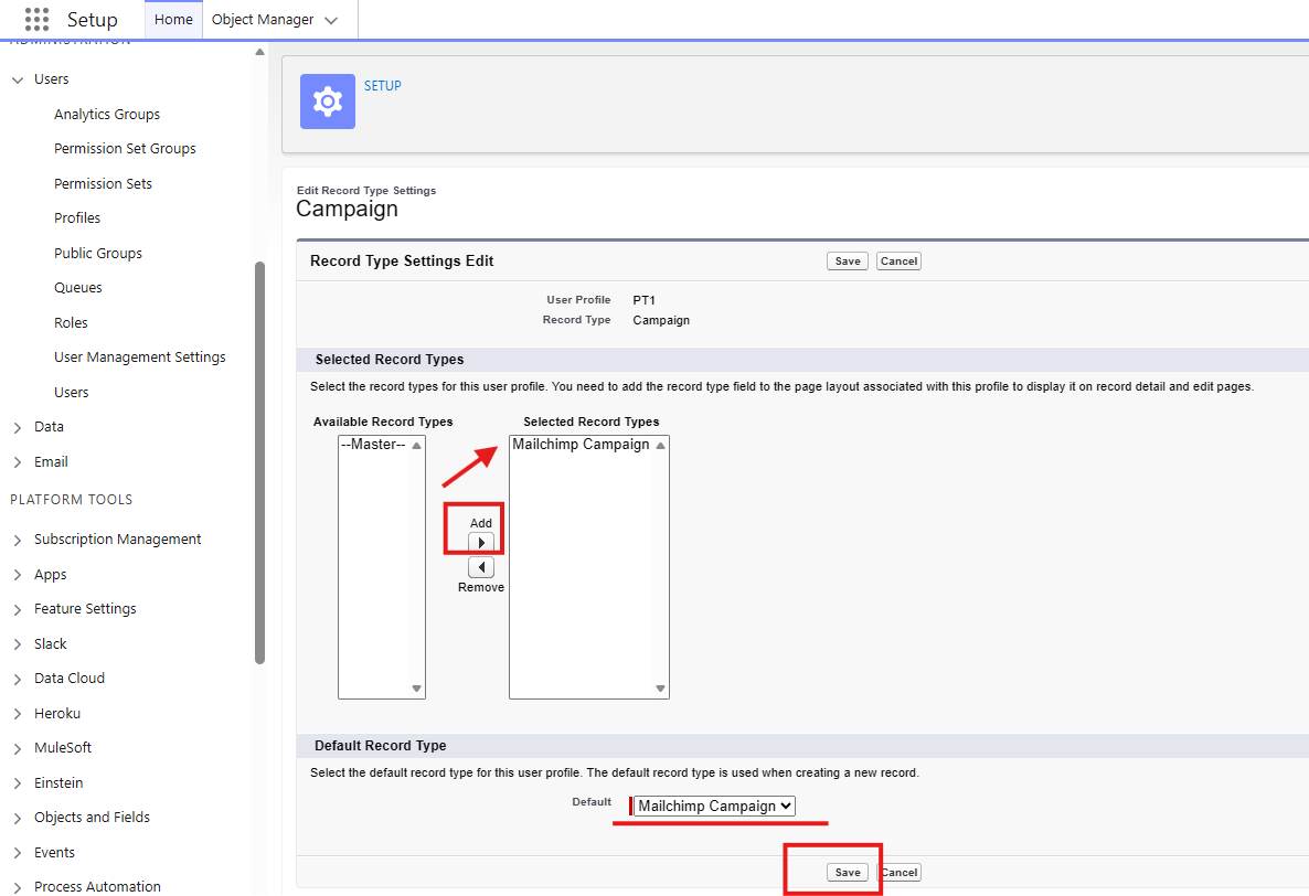 The Mailchimp Campaign record type will need to be moved to the Selected Record Types column