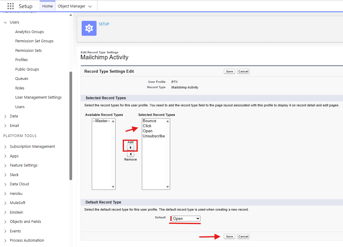 The Mailchimp Member record type will need to be moved to the Selected Record Types column